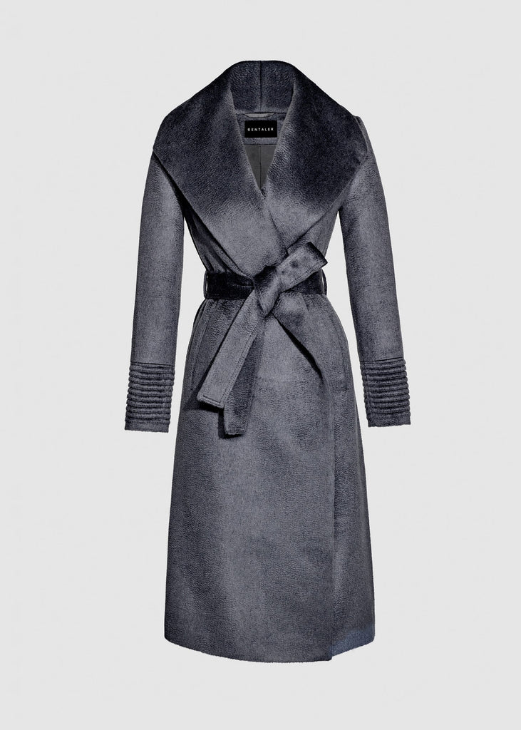 Full-length wrap coat crafted from incomparably soft and lustrous Zibeline Suri Alpaca wool. Designed with a shawl collar, vented back hem and SENTALER's signature ribbed detail on the sleeve cuffs, this coat is the perfect elevated staple. Lined. Features welt pockets and self-tie belt at waist.