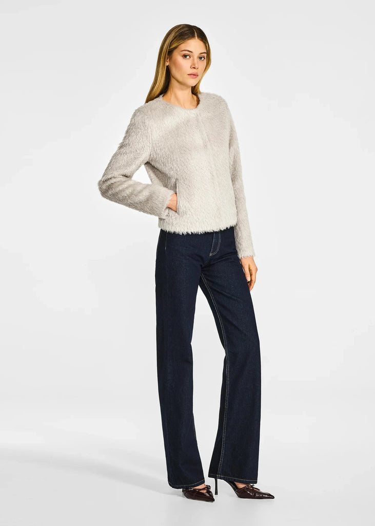 Waist length moto jacket crafted from textured Suri Alpaca wool, known for its supreme warmth and natural thermal insulation. This fully lined style featuring concealed snap closures and welt pockets will become your wardrobe staple. Lined.